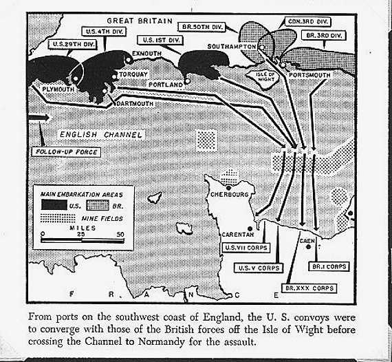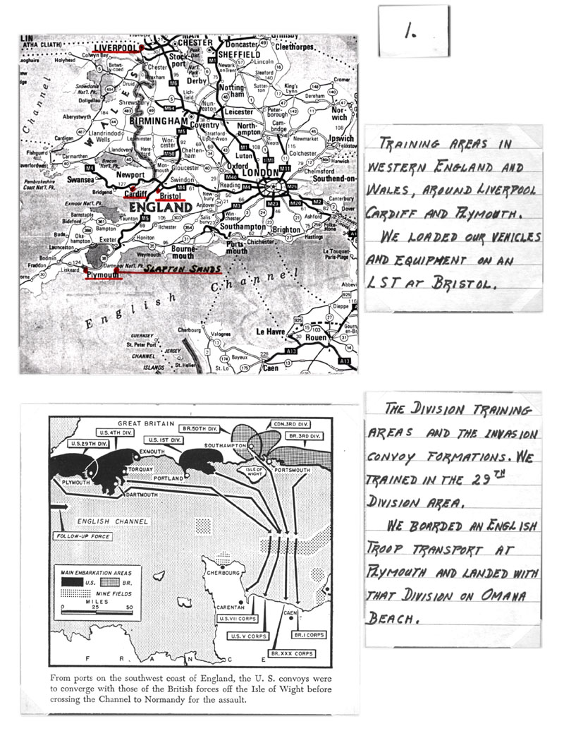 The Division Training Areas and the Invasion Convoy Formations. We trained in the 29th Division Area. We boarded an English Troop Transport at Plymouth and landed with that Division on Omaha Beach. |